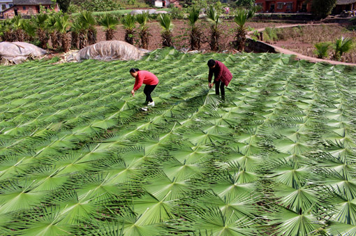 在郭北镇放生桥村,当地农户抓住晴好天气晾晒蒲葵。