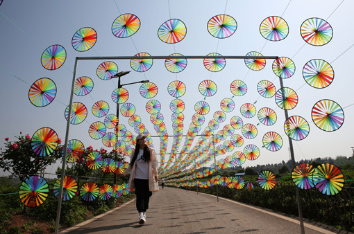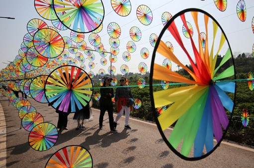 四川新闻网内江4月16日讯(兰自涛)4月12日,游客在四川省内江市东兴区田家镇“长江田园”里游园赏景。