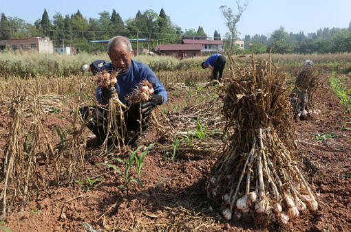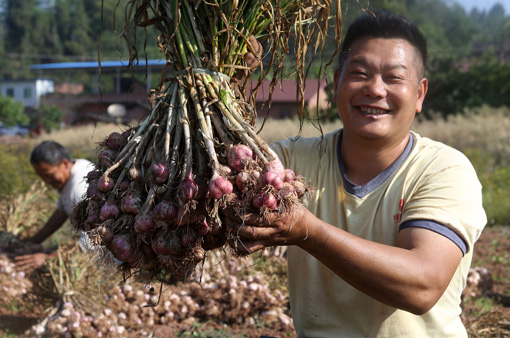 近日,四川省内江市东兴区田家镇的紫皮大蒜种植基地迎来丰收季,蒜农们抓住晴好天气及时采收和晾晒大蒜。据了解,田家镇是当地有名的大蒜之乡,出产的“田家紫皮大蒜”是国家地理标志保护产品,以独特的色泽和蒜香驰名省内外。近年来,该镇引导蒜农组建专业合作社,加强与科研院所合作,引进新技术,提高大蒜品质,注册商标并开发紫皮大蒜系列特色产品,大蒜产业已成为当地农民增收的重要渠道。据统计,田家镇紫皮大蒜种植面积已达10000余亩,预计年产量750余万公斤。