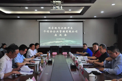 在随后召开的座谈会上,内江经开区党工委书记赵永韦,区党工委副书记、管委会主任万伟等区主要领导、部门负责人与杜华一行就合作事宜深入交流,双方签订合作框架协议,赵永韦为华领会公司、杜华、黄天平颁发聘书,聘请成都华领会企业管理有限公司为国家级内江经济技术开发区招商合作单位、聘请杜华、黄天平为国家级内江经济技术开发区招商顾问。