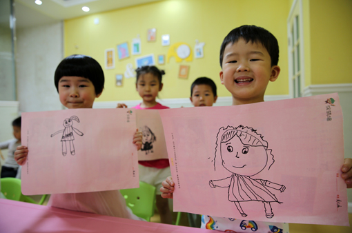 四川新闻网内江5月9日讯(兰自涛 李银燕)5月9日,在四川省内江市东兴区格外幼儿园,小朋友们正在展示自己创作的绘画作品。