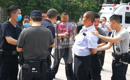 五一节以后,法警队按照本院训练计划第二阶段的要求,近日加强了对上访人员拉横幅、使用具有伤害的器具冲击法院的实战应急演练,在演练过程中,当事人无理取闹、不听劝住、非法堵门等行为,在严重影响单位正常上班秩序的情况下警队应急处突小组得到命令以后迅速做出反映,按照实战训练的流程将当事人控制并带离现场。