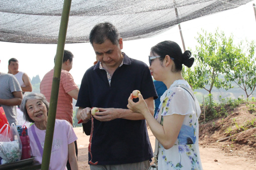 四川新闻网内江5月18日讯(李永琴 文/图)5月17日,内江市东兴区双才镇五龙村金果园正式开园,光鲜红润的蜜桃挂满枝头,成群结队的游客在树下拍照、采摘、品尝,忙得不亦乐乎。