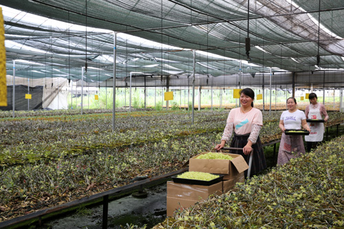 四川新闻网内江5月28日讯(兰自涛 文/图)5月26日,在四川省内江市东兴区田家镇千草中医药康养文化村,村民正在采摘铁皮石斛鲜花。