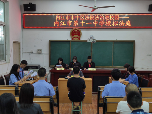 四川新闻网内江6月16日讯(刘世彬)5月28日下午,内江市市中区法院少审团队干警到内江市第十一中开展法治进校园之模拟法庭活动。选取未成年人犯抢劫罪的案例,由高二年级学生代表扮演合议庭、公诉人、辩护人等刑事诉讼参与人员,全校初一至高三年级约150名师生代表参与活动。