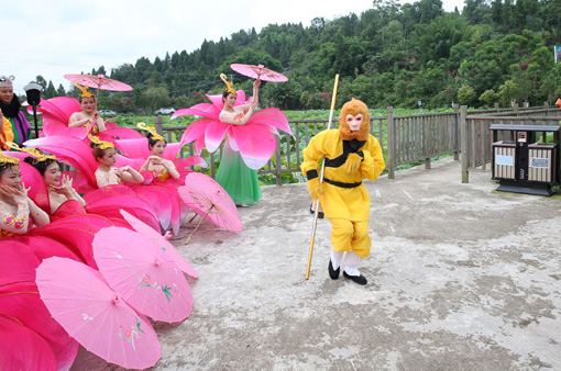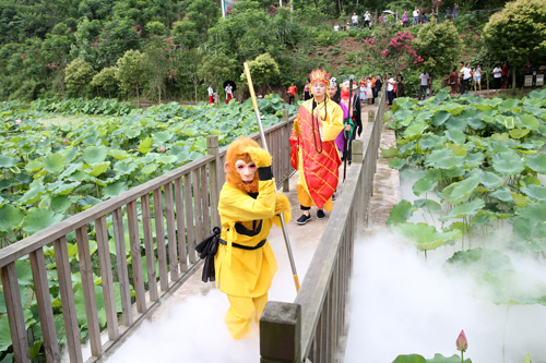 四川新闻网内江7月9日讯(兰自涛 文/图)7月9日,在四川省内江市东兴区高梁镇杨岭村,“唐僧师徒”畅游“荷花谷”,吸引了众多游客的目光。