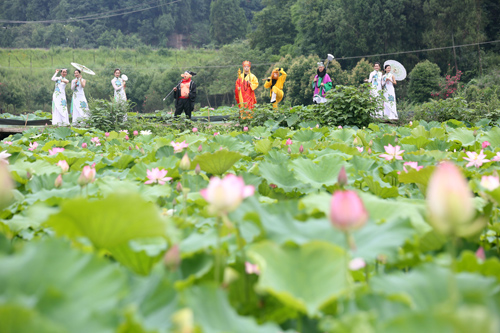 当日,四川省内江市东兴区高梁镇杨岭村举办一年一度的荷花节,并设置了踩水车、推磨、摸鱼等农事体验项目,让游客在赏荷观花的同时,体验农村特色风情。为活跃气氛,吸引游人,杨岭村还推出“唐僧师徒巡游荷花谷”活动,由演员扮演的“唐僧师徒”沿着谷中的赏花路线悠然而行,吸引了众多游客的目光。