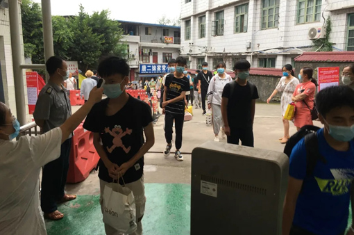7月11日上午8点,四川新闻网在现场看到,第一辆满载考生的送考车驶进学校大门,考生有序从车上下来,到指定地点进行体温监测,所有体温正常考生方可进入考点。