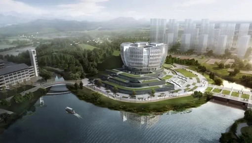 内江师范学院新校区建设项目采用了生态校园、园林式校园的设计理念,设计中结合原有水体基础,打造贯穿全校的景观水系,绿地景观及水体建设面积达58.4万平方米。其中,教学楼群的滨水布置,顺应水势高低错落,显得绿意盎然、疏密有致,有利于营造出独具中国古典园林意境的校园空间。