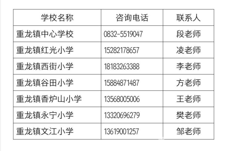 重龙镇中心学校招生300人;红光小学招生200人;西街小学招生200人;谷田小学招生50人;香炉山小学招生50人;永宁小学招生50人;文江小学招生50人。