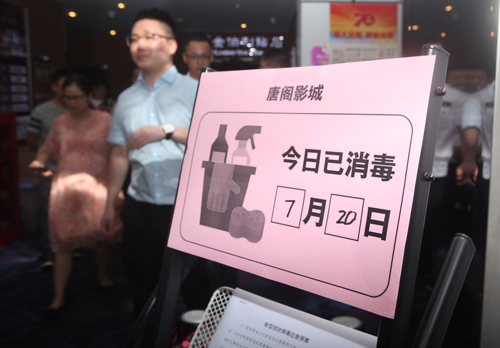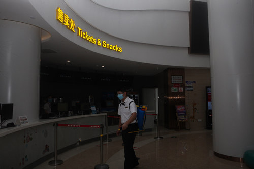 7月20日,内江市东兴区影城员工为电影院消毒。