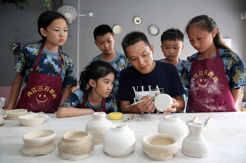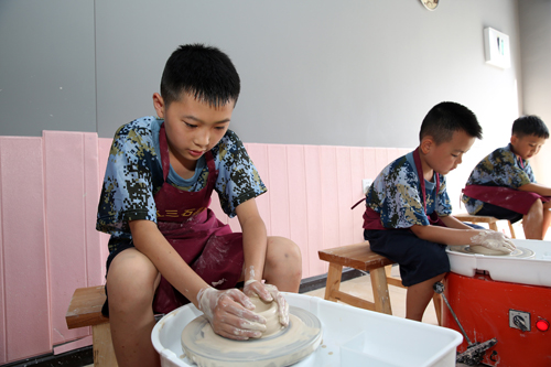 四川新闻网消息(兰自涛 文/图)7月22日,在四川省内江市东兴区长江大课堂研学基地,孩子们在老师的指导下学习陶器手工制作。