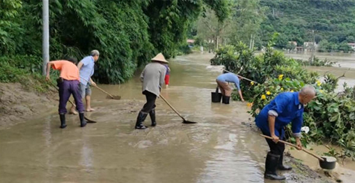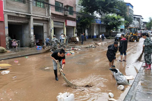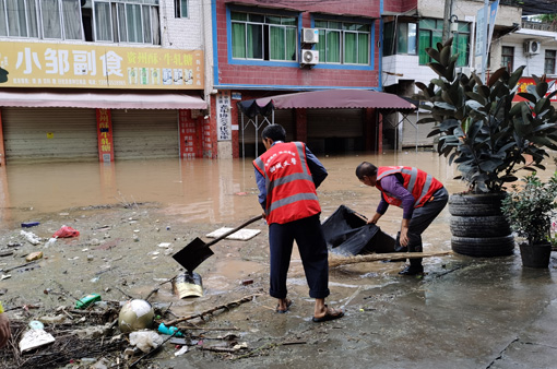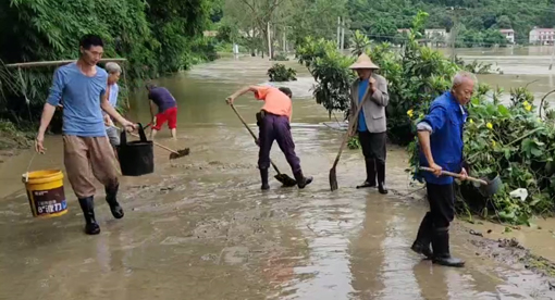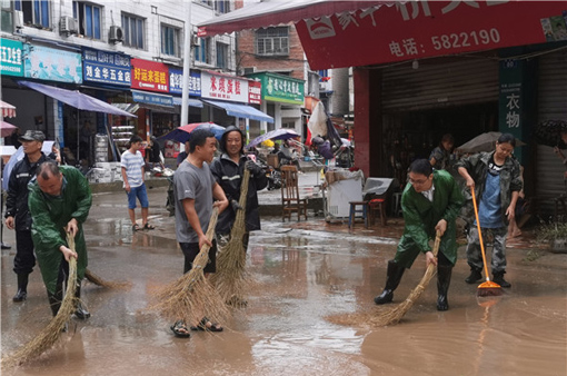 水退一点、垃圾清理一点。鱼溪镇党员干部冒雨清理被洪水冲来的垃圾