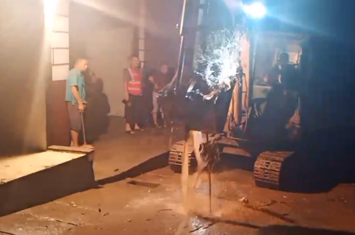 8月17日晚八点,在发轮社区发轮大桥桥头,洪水稍退,镇干部和社区干部调用挖机清淤