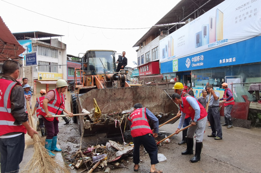 18日上午,球溪场镇洪水逐渐消退,干部群众、社区职工齐心清淤。