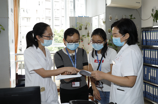 派驻区卫健局纪检监察组组长柳红(左二)查看区人民医院药品采购台账。 (图:李勇)