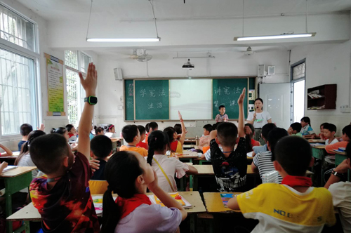 活动课上,老师们针对小学生的心理特点、日常生活及学习内容,采用身边较为典型的案例,用通俗易懂的语言,通过以案说法的形式为同学们分析了法治案例,讲解了如何运用法律武器保护自己的合法权益,并且通过一问一答的互动形式,让同学们加深对宪法知识的理解。
