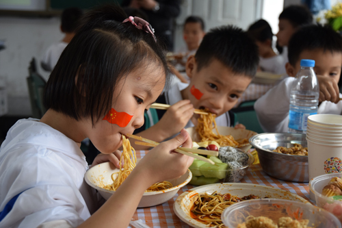 在内江市第十三小学,孩子们正在以吃面的方式表达“国泰民安”的美好祝愿。(东兴区委宣传部供图)