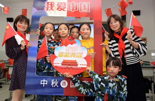 在内江市第十三小学,孩子们正和老师一起合影,表达对新中国生日的美好祝福。(东兴区委宣传部供图)