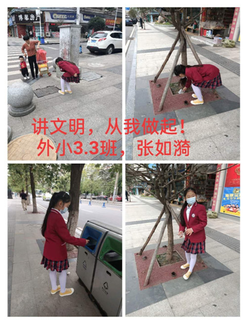 “文明旅游伴我行”,该校学生在双节期间陆续地走上大街,拾捡垃圾,用行动号召他人文明出行。