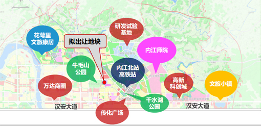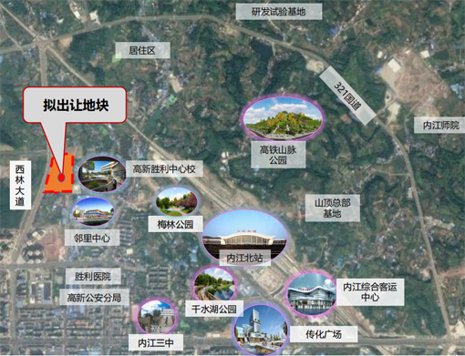 出让地块位于内江高新区高铁片区,处于高新区核心位置。东侧毗邻高铁站,距离高铁北站仅1.1km,区域交通便捷,可融入成渝双城经济圈建设,辐射带动有力。地块周边均有道路与城市主干道汉安大道、西林大道相通,能快捷到达内江城市核心区,与万达商圈、传化商圈、高桥商圈连接紧密。同时地块周边绿化、商业、文化、医疗资源等配套完善、区位优越,具有极大的发展潜力。
