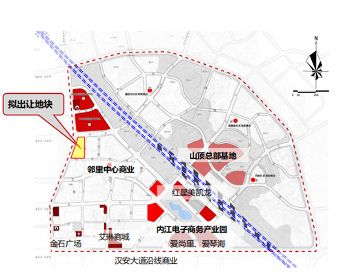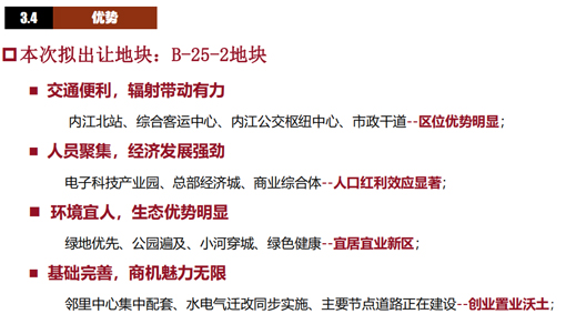 本地块依托内江北站、综合客运中心等便捷的道路交通条件,周边人流量大,具有极强扩张发展潜力。地块周边打造购物公园+商业街区。包括传化广场爱尚里、爱琴海购物、山顶总部基地等项目,吸引人流,集聚商业。
