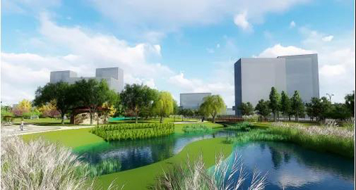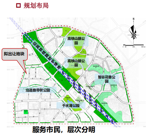 高铁片区区域内绿化面积高达30%,为“北干南支”的树状绿地系统结构。2个综合公园:高铁山脉公园、千水湖公园,1个专类公园:智谷花香公园带状公园沿片区主干路分布。