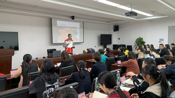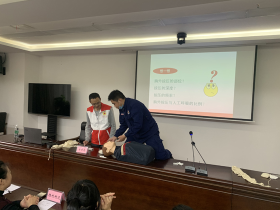 内江市红十字会救护培训专业讲师李寻觅首先通过PPT播放与知识点讲解形式向学员仔细讲授了心肺复苏、创伤应急救护、海姆利克氏急救法等应急救援救护知识,然后通过人体模型一个环节一个环节地给学员现场模拟了如何实际操作每个应急救护动作以及需注意的要点,最后组织学员们开展了现场集体演练,并给每个学员进行了指导纠正,进一步深化学员们的感知认识。