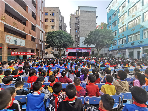 11月18日,在资中县重龙镇中心学校,来自资中县木偶剧团的演员们正在为学校师生和当地社区的党员干部表演精彩的快板节目《五中全会指方向》。除了快板节目,现场还有舞蹈《英姿》、人偶组合舞蹈《美阿里》、歌曲《少年》等节目,热情讴歌了在中国共产党领导下,我国“十三五”取得的可喜成绩,表达了人民群众对实现“十四五”的规划目标充满信心。节目中还有紧扣当前时事的人偶剧《众志成城抗疫情》,三句半《融入双城谱新篇》等节目,让现场观众看得津津有味,掌声不断。