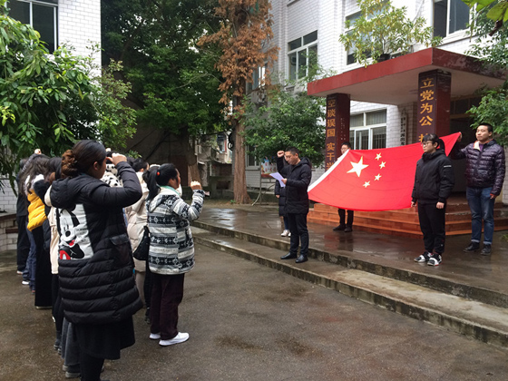 全体在岗干部职工在领宣人、政法委员兼副镇长周建的领宣下,右手举拳,宣读誓词:“我宣誓:忠于中华人民共和国宪法,维护宪法权威,履行法定职责,忠于祖国、忠于人民,恪尽职守、廉洁奉公,接受人民监督,为建设富强民主文明和谐美丽的社会主义现代化强国努力奋斗!”