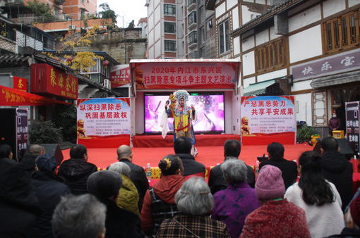 四川新闻网消息(李永琴 文/图)12月8日,由内江市东兴区扫黑除恶专项斗争领导小组、东兴区委政法委主办的“扫黑除恶”专项斗争主题文艺演出活动在东兴老街举行,旨在以文艺演出的形式,向居民展示“扫黑除恶”成果,提升人民群众安全感和幸福感。