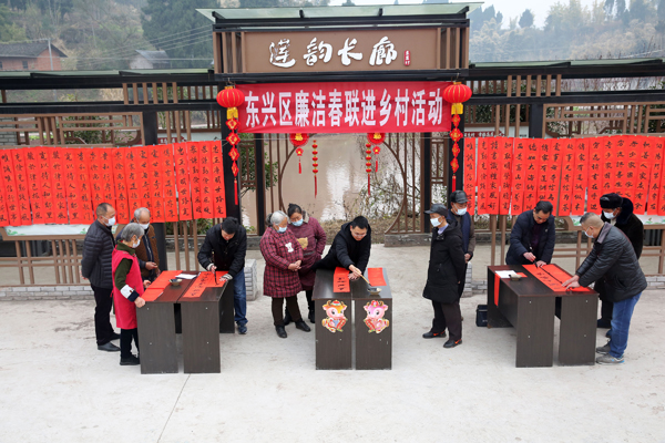 在新春佳节来临之际,四川省内江市东兴区纪委监委启动“廉洁春联进乡村”活动,邀请书法家组成小分队深入乡镇和村社,免费为党员干部和村民书写以倡廉颂廉和家风家教为主题的“廉洁春联”,通过这种以“联”促“廉”的形式营造风清气正、欢乐祥和的“廉节”氛围。