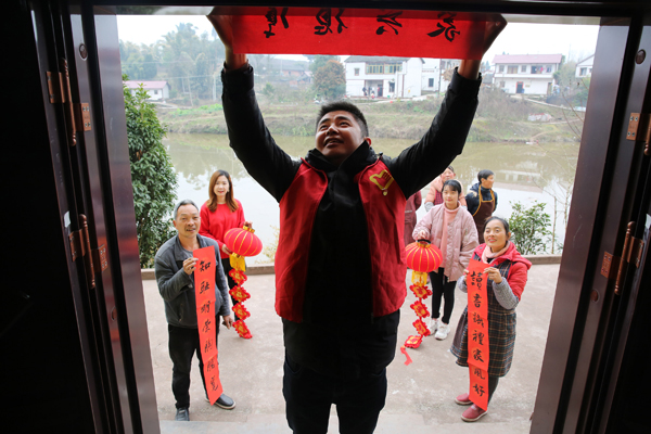 2021年2月2日,在四川省内江市东兴区双才镇高屋村,区纪委监委的志愿者正在帮村民张贴廉洁春联。