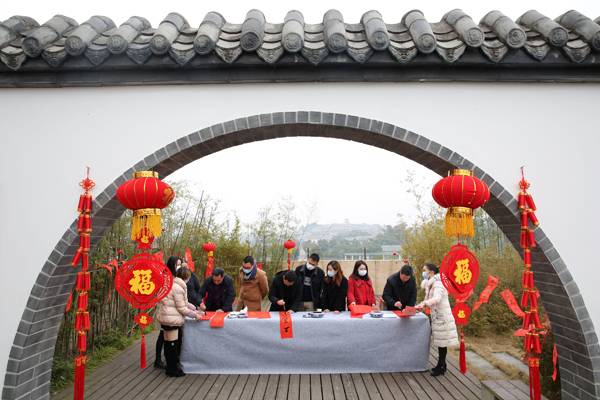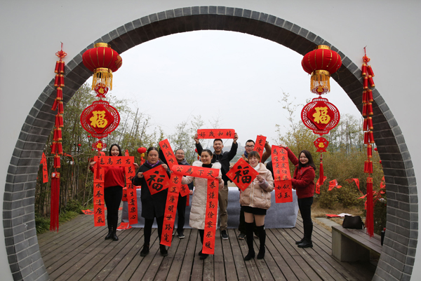 2021年2月2日,在四川省内江市东兴区田家镇正子村,党员干部和村民正在展示书法家书写的廉洁春联。