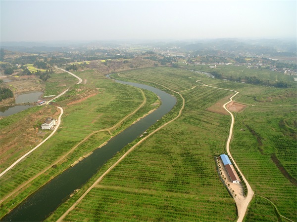 阳光下,雪白的李花、金黄的油菜花、粉红的桃花洒满了小清流河的两岸;生产便道与其他水利设施直通山顶,在连绵起伏的山丘之间盘旋,在春的滋养下,大片大片的枳壳充满了勃勃生机。