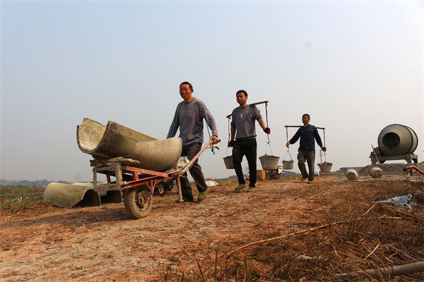 在现场,水保项目已经进入扫尾阶段。施工工地上,工人们抬的抬,推的推,挑的挑,安装U型槽,赶制空心六棱块,现场一派忙碌景象。“土沟可以略微浅一点,既减少土方开挖成本,又减少U型槽的安装材料。”在沟渠与生产便道的连接点,东兴区水利局分管水保工作的副局长张立在巡视中还不时与安装师傅进行探讨交流,力求每一个点位都能够完美收官。