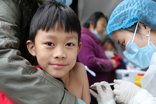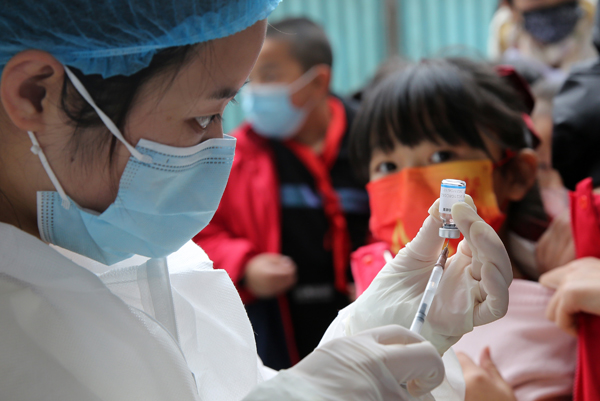 2021年11月9日,在四川省内江市第十三小学校,适龄儿童在监护人的陪同下接种新冠病毒疫苗。
