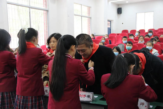 在主持人的引导下,7名优秀的少先队员手捧鲜艳的红领巾,迈着整齐的步伐进入我们的视线,熟练地为领导、老师佩戴上少先队员的标志——红领巾。