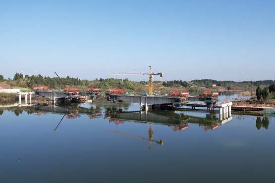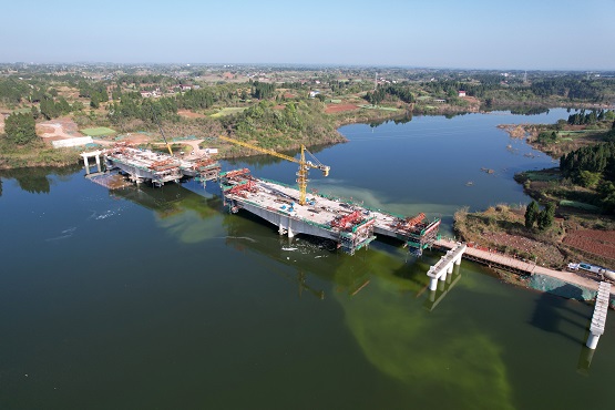 四川新闻网消息 3月17日,在位于四川省内江市东兴区顺河镇的内(江)大(足)高速公路联合水库大桥施工现场,工人们正在加紧施工,全速推进高速公路建设。