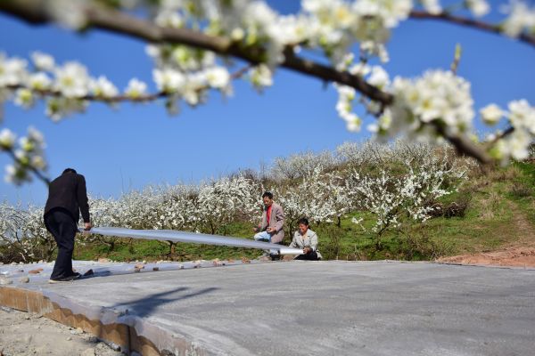 3月7日,在内江市东兴区白合镇报恩寺村,人们正对刚浇筑的乡村公路开展养护作业。