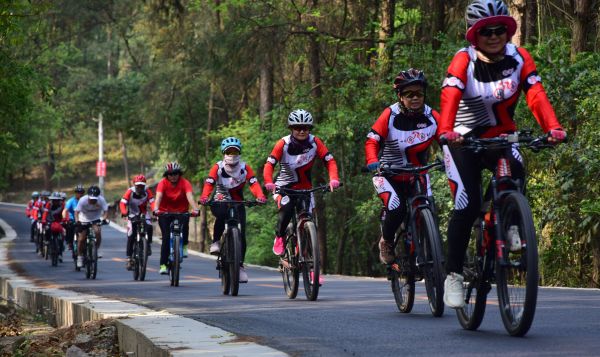 3月19日,在内江市东兴区郭北镇长坝村,骑游爱好者正在乡村公路上骑行。
