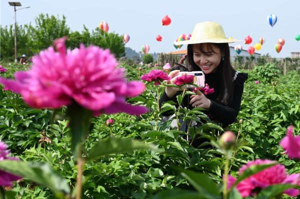 近日气温回升,四川省内江市东兴区田家镇正子村“长江田园”的10万余株牡丹花次第绽放,花香四溢,成为当地有名的“网红打卡地”,吸引了不少游客前来赏花拍照。