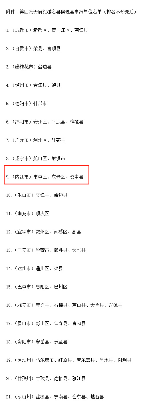 四川新闻网消息(李永琴)5月11日,四川省文化和旅游厅发布《关于第四批天府旅游名县候选县申报单位初审结果的公告》,经自愿申报、市(州)推荐,截至2022年4月27日,共收到55个县(市、区)申报天府旅游名县候选县的申请材料。依据《天府旅游名县评选办法(修订)》,省文化和旅游厅组织对各单位的申报材料及有关情况进行了资料审查,有54个申报单位达到“候选县评选条件”,纳入本次天府旅游名县候选县申报范围。其中内江市市中区也在此列。
