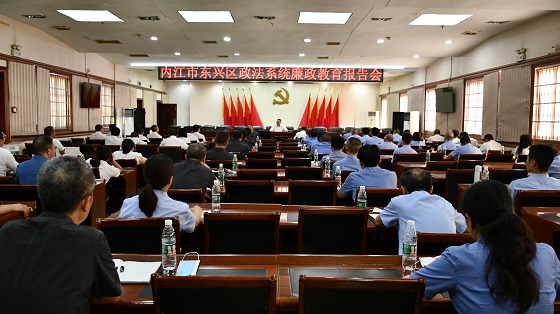 四川新闻网消息(陈颖 毛悦)7月12日,内江市东兴区召开政法系统廉政教育报告会。区委常委、区纪委书记、区监委主任官俊作专题廉政报告,会议由区委常委、政法委书记周勇主持。区委政法委、区政法各单位班子成员、中层以上干部及政法干警代表,各镇(街道)政法委员、“两所一庭”负责人参加会议。