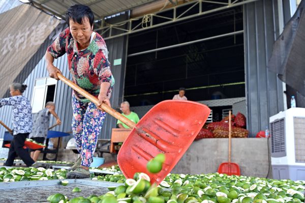 ▲7月28日,在内江市东兴区石子镇七星村枳壳基地,当地村民将晾晒后的枳壳送往烘干房。
