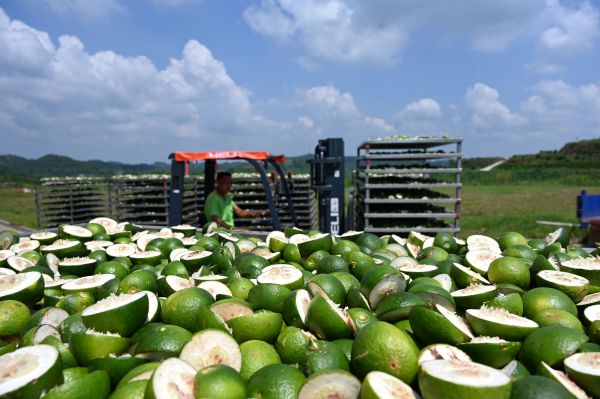 ▲7月28日,在内江市东兴区石子镇七星村枳壳基地,当地村民正在将切片枳壳分床。