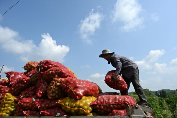 ▲7月28日,在内江市东兴区石子镇七星村枳壳基地,当地村民正在将新采收的枳壳装车。