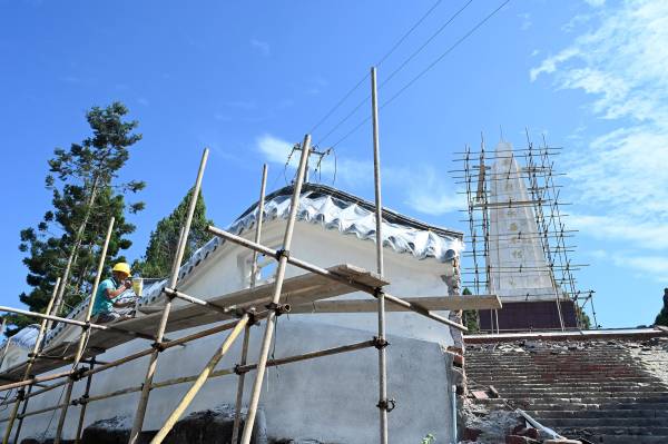 四川新闻网消息 2022年8月9日,在四川省内江市东兴区顺河镇烈士墓前,工作人员正对纪念碑周边地面进行修缮。