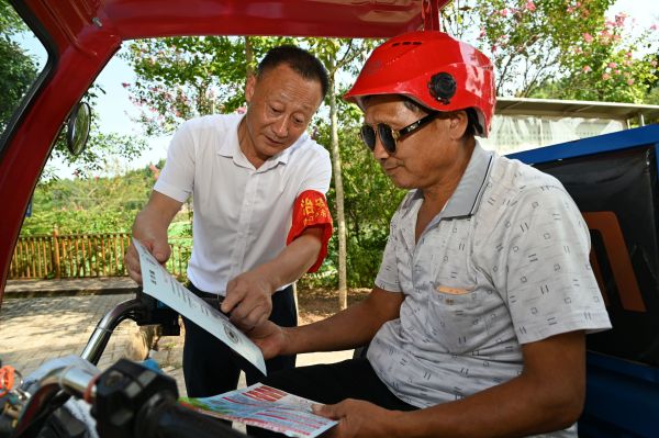 ▲8月23日,在内江市东兴区高梁镇杨岭村,村干部向过往群众宣传森林防火及防汛抗旱知识。