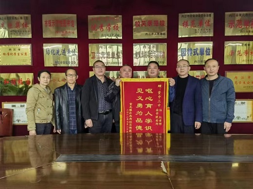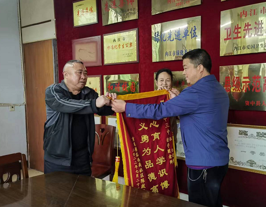 四川新闻网消息(陈颖 王章彬)11月8日上午,资中县重龙镇后西街社区居民陈啟龙夫妇将印有“呕心育人学识博,见义勇为品德高”的锦旗送到资中三中,感谢资中三中徐学欧、伍红老师见义勇为的行为给予了陈啟龙“第二次生命”。